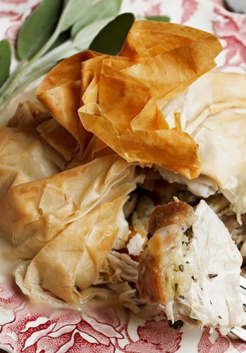 Place a dollop of cooled cranberry sauce in the center; top with several pieces of cooked turkey or chicken; using a 1 cup measuring cup, pack stuffing in, then place a dome of stuffing over the top of the turkey, pressing it together into a mound. Lift the 2 right corners of the outside edge of the phyllo and bring it up in to the center, pleating as needed. Bring the 2 left corners up to the center, and pinch together with the other side, twisting to lock them together. Transfer to a parchment lined baking sheet. Repeat with the remaining phyllo and fillings to make 4 parcels. (They can be covered and refrigerated at this point for up to a day or parcels can be frozen. Defrost in wrapping before baking).
