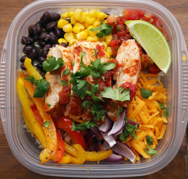 Add a base of brown rice to 4 food storage containers; top each with a scoop of black beans, corn, additional salsa, Cheddar cheese, cooked peppers and onions, and sliced chicken. Garnish with a lime wedge and fresh cilantro, if desired.