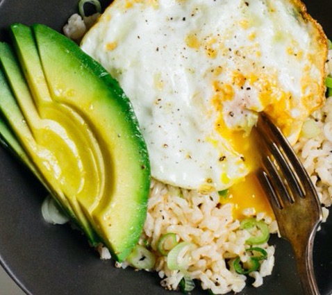 Brown rice is the base for this healthy, protein rich meal, along with a fried egg, sliced scallions, and avocado slices and a bit of hot sauce. This easy, quick meal will surely not disappoint you at lunchtime.