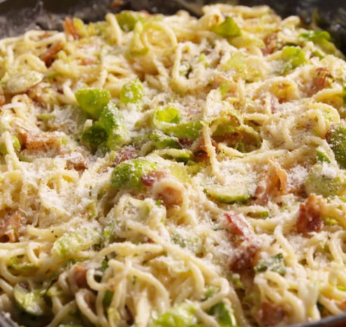 You will be pleasantly surprised at how well spaghetti goes with brussels sprouts and bacon. Garnish it with cheese and you have a fantastic meal. Serve it with garlic toast.