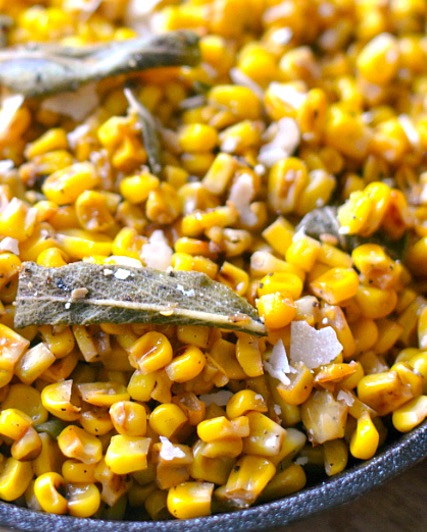 Want to jazz up that boring corn that you have been serving for years? Try this quick, easy frozen corn with fresh sage leaves in browned butter and garnished with Parmesan cheese. It will make those holiday meals just a little more special.