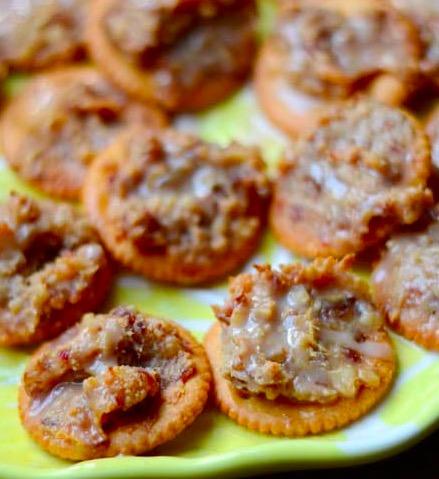 Remove from heat. Use a small spatula or spoon to spread the mixture on the crackers, anywhere from just a dab to a heaping mound. Bake for 5 - 7 minutes, or until the crackers are just slightly more golden brown around the edges. Remove from the oven; place the baking sheet on a cooling rack to cool.