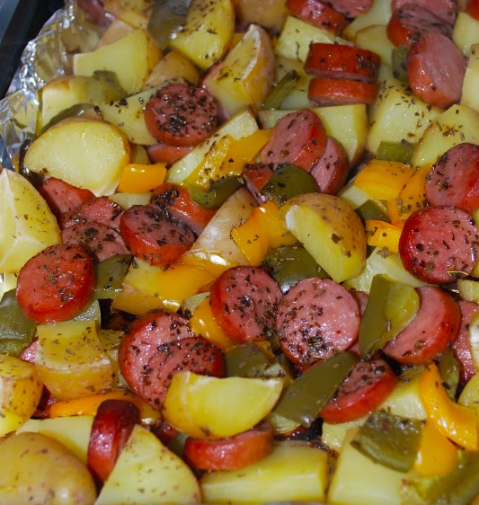 Simple and quick complete meals are the way to go for dinner. This dinner is baked in just one foil lined baking pan, so clean up is a snap. Change the ingredients according to what is in season or to your personal taste.