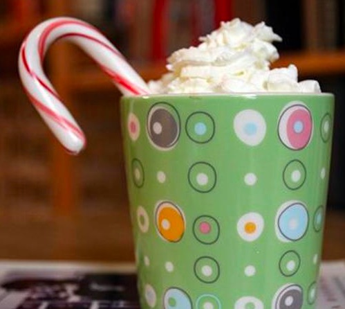 Steam milk; add to remainder of cup. Garnish with whipped cream and sugar crystals and finish off with a peppermint candy cane.