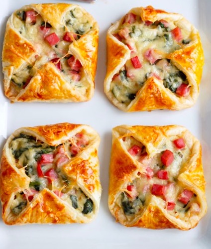 Arrange puff pastry squares on the prepared baking sheet. Dollop on 1 - 2 T. Bechamel mixture; top with more grated cheese; close pockets by folding the corners on top.