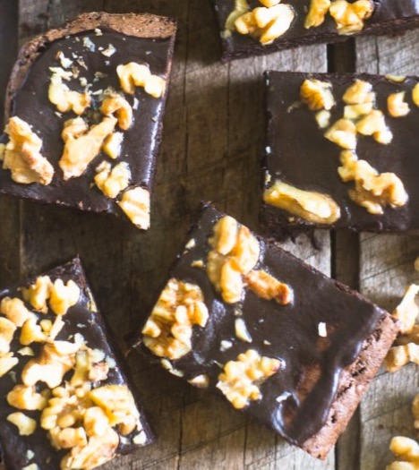 Pour the glaze onto the cooled brownies; spread gently with a spatula. Sprinkle on the walnuts. Allow the glaze firm up before cutting into squares.