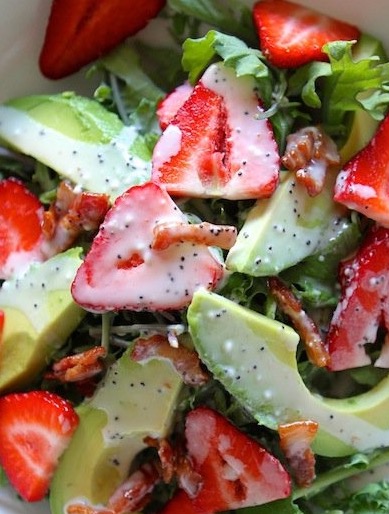Strawberry Avocado Kale Salad with Bacon Poppyseed Dressing