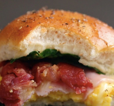 Spread the scrambled eggs evenly across the rolls, followed by the ham, Cheddar, bacon, and spinach. Place the remaining half of the rolls on top. Brush with melted butter. Sprinkle the pepper on top.