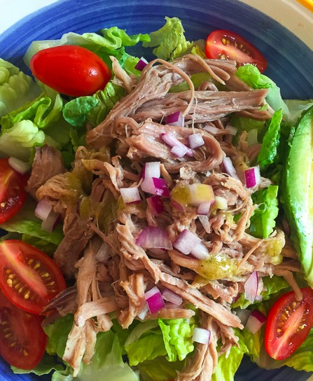 This Hawaiian inspired slow cooker pork is easy to make and only has 3 ingredients. The crockpot does the work for you and makes the pork nice and juicy. Serve it with rice, in a salad with your favorite ingredients or in lettuce wraps, if desired.