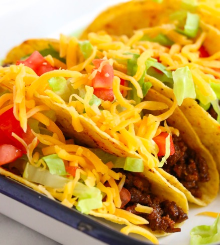 Heat taco shells according to the package directions; assemble by placing 1/4 c. beef in each shell, topped with lettuce, 1 T. cheese and tomato.
