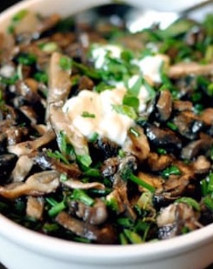 Place the roasted mushrooms back into the bowl; taste; add salt and pepper, if necessary. Toss with the herbs; transfer to a serving dish; top with a dollop of sour cream.