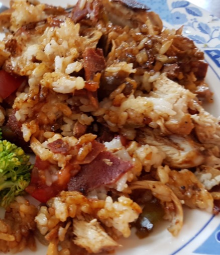 In the skillet, add soy sauce and balsamic vinegar; cook the peppers and other veggies you may have added until fragrant, about 5-9 minutes. Add the rice; mix well. Add the chicken and bacon; mix well.