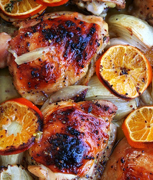 If marinating, place chicken with Clementine slices, thyme sprigs, onion pieces and crushed fennel seeds, if desired, in a large mixing bowl or ziplock bag; turn several times to coat. Marinate chicken for several hours or overnight.
