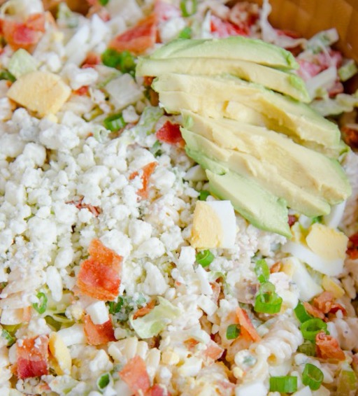 Add a little chicken to your Cobb pasta salad and make it even better. It's packed with wonderful ingredients like hard boiled eggs, avocado, blue cheese and pasta in a tasty, creamy dressing. It's great anytime of the year but especially for spring of su