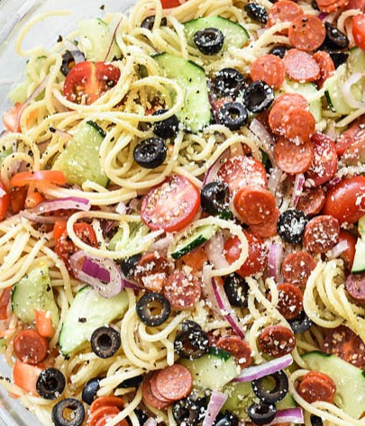 Add spaghetti to a large bowl with cucumbers, bell pepper, onion, tomatoes, pepperoni, olives and cheese.