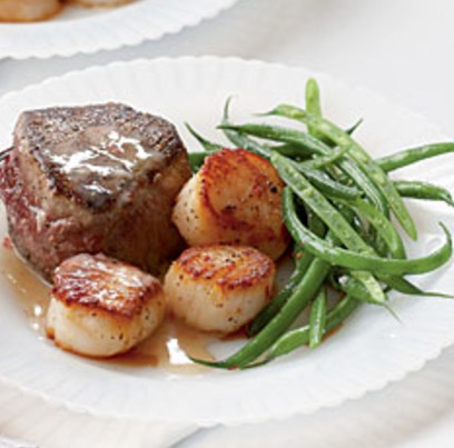 Sprinkle both sides of steaks with 1/8 t. each salt and black pepper. Sprinkle both sides of scallops with 1/8 t. each salt and pink peppercorns.