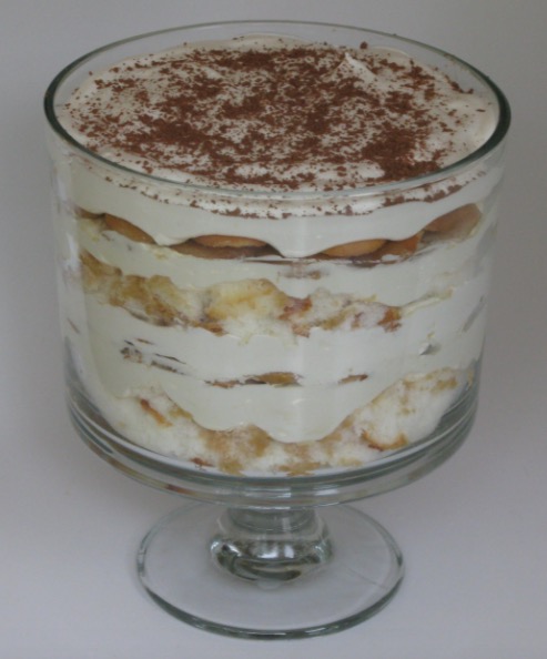 In a large, clear serving bowl or trifle bowl, lay the soaked ladyfingers at the bottom of the bowl, covering the entire base. Spoon on the mascarpone mixture, smoothing over the top and into the edges of the bowl.