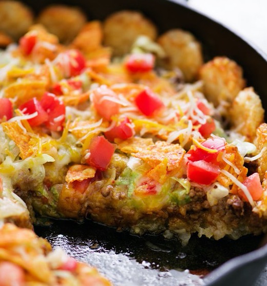 Kids and adults love tater tots, tacos and pizza, so why not combine them? The tater tots serve as the pizza crust and then the rest is full of traditional pizza and taco ingredients. It's makes for a fun meal for all.