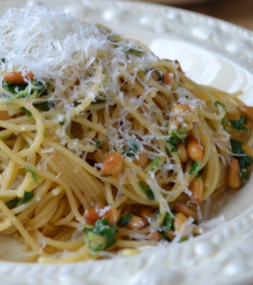 Meatless Monday or maybe Friday? Try spaghetti with olive oil and roasted garlic. Yum. What makes it even better? toasted pine nuts and Asiago cheese. Serve with garlic bread or Texas toast and a side salad.