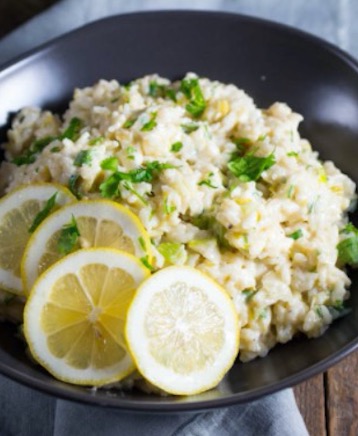 You can serve this risotto as a main or a side dish. It has a mellow, fresh flavor that everyone will love. Be sure to use the fresh lemon for its zest and freshly squeezed juice to get the best flavor. If wanting a vegetarian dish, use vegetable broth/st