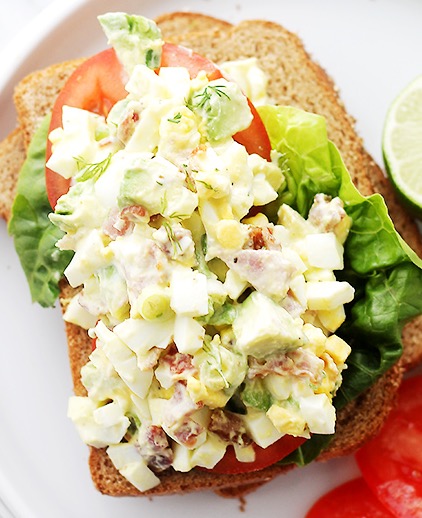 There is no need to use mayonnaise to make a delicious egg salad. This salad is made with avocado instead along with crunchy bacon, green onions and yogurt.