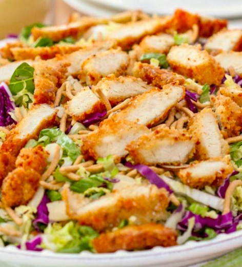 This is a favorite salad recipe for Applebee's patrons and now you can prepare it at home. You can substitute prepared frozen chicken strips to save yourself the frying and save calories by serving the dressing on the side.