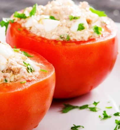 Fill tomatoes with tuna mixture; top with more tuna and Cheddar cheese.