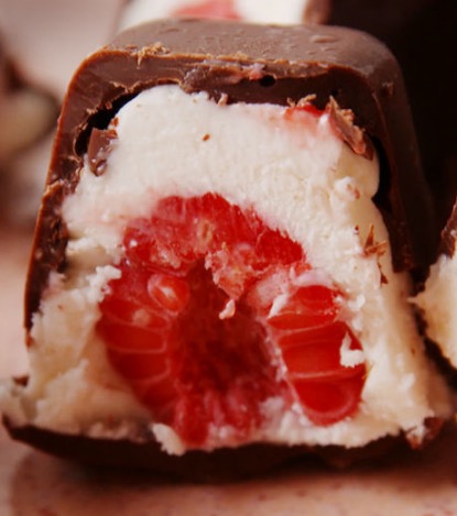 Fill each ice cube mold about halfway with the cream cheese; press a raspberry into the center of the mixture; fill the rest of the mold with the cream cheese mixture; top with melted chocolate.