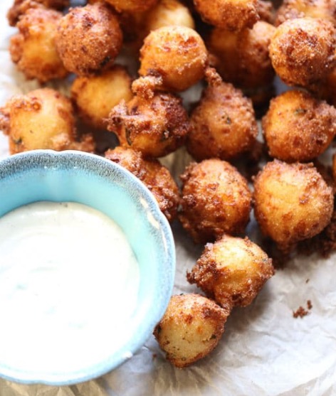 Give traditional hush puppies a Tex-Mex flavor with some Pepper Jack cheese and poblano peppers. Then use buttermilk, Greek yogurt and Ranch seasoning to make a sauce to dip these tender, fluffy little puppies in. Yum!