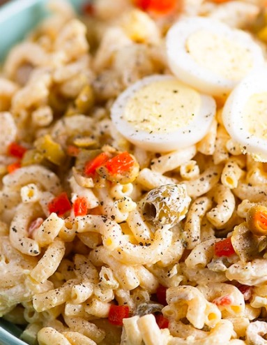 Summertime means that it's time to serve macaroni salad at home or fun get togethers. It doesn't take a lot of time or effort to make this classic one with macaroni pasta, mayonnaise, hard boiled eggs and onion. The green olives add an unexpected burst of