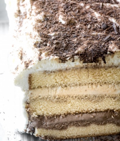 Make a grown up tiramisu ice cream cake that's simple to make and no baking is involved. It will be a hit with everyone that eats it. It looks like it took you all day to make when it really only takes about 15 minutes to assemble.