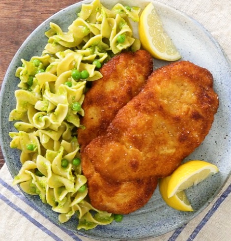 Your family will thank you for making this classic Austrian dish with a little twist. It comes with a creamy pesto sauce and peas and is served along with buttery egg noodles. It's a simple, comforting meal that goes together quickly.