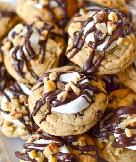 Take the best ingredients and flavors in Rocky Road ice cream and put them in cookies. These delicious cookies are stuffed with chocolate chips and walnuts and are then topped with marshmallows and drizzled with chocolate.