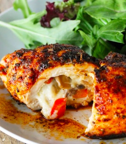 Make this chicken that's stuffed with pepper jack cheese, bell peppers, mushrooms and onions and seasoned on top with Cajun seasoning. What's great is that each chicken breast can be seasoned with as much or as little seasoning as desired to suit each per