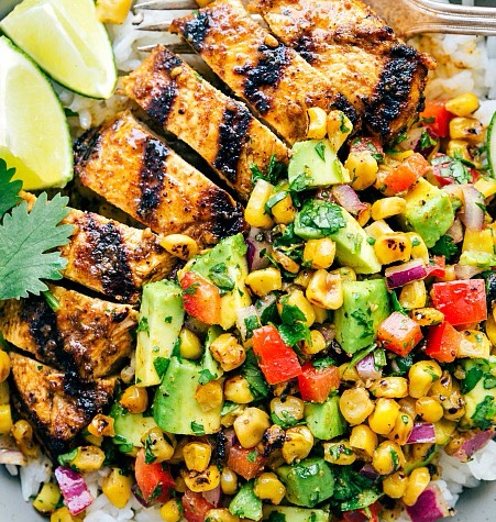 Grilled Taco Chicken Bowls with a Corn Avocado Salsa