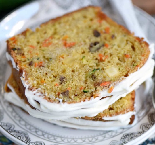This isn't just zucchini bread, it has shredded carrots and zucchini, diced apples and pecans along with orange juice and spices. But that's not all. It is glazed with a yummy cream cheese and powdered sugar that takes it over the top.