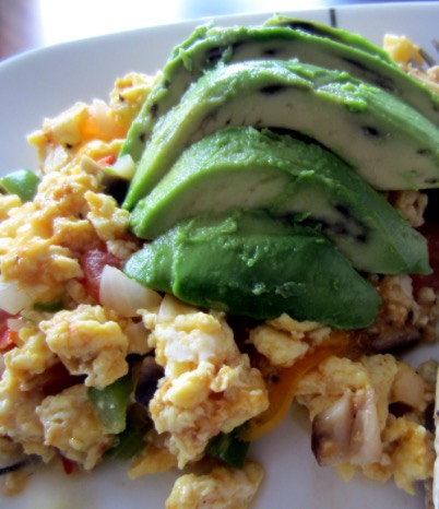Serve eggs and veggies seasoned pepper and salt, if desired. Top with avocado slices.