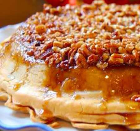 Remove pie from oven; cool on wire rack for 5 minutes. Place a serving plate over pie; carefully invert hot pie; remove pie plate. If some nuts remain in pan, replace on pie.
