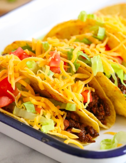 Heat the taco shells according to the package directions. Assemble tacos by placing 1/4 c. beef in each shell, topped with lettuce, 1 T. cheese and diced tomato.