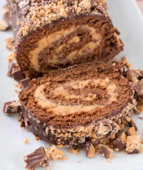Love chocolate? How about peanut butter? You'll love this easy to prepare cake in a roll. It's a rich chocolate cake filled with peanut butter cups, cream cheese, whipping cream and semi-sweet chocolate chips. Yum yum!