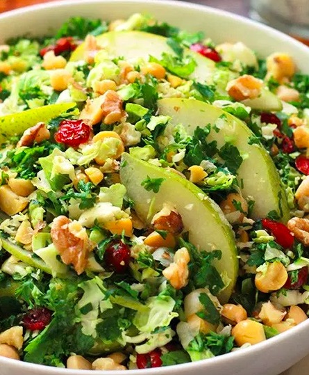 Wow friends and family with a truly amazing and unique salad. It's healthy and fresh with Brussels sprouts, parsley, chickpeas, pears, cranberries and walnuts.