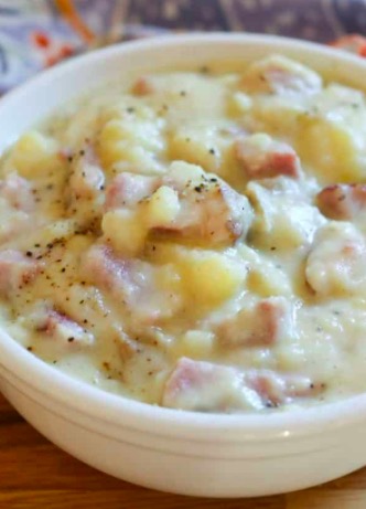 Combine potatoes and ham in the crockpot. Pour enough milk into the crockpot to almost cover potatoes; stir or smash with a heavy spoon or masher to combine; cover; cook on LOW 4 hours or HIGH 2 hours. Stir; lightly smash any large chunks of potato. Season generously with salt and pepper; taste; adjust seasonings as needed. Cover; cook 1-3 on LOW. Add more milk to thin the soup to desired thickness.