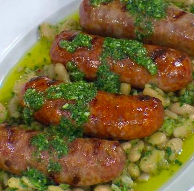 Place the cooked sausage on a platter; top with the beans and the remaining pesto.