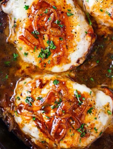 While onions are sautéing, season both sides of pork chops with salt, pepper, thyme and garlic powder.