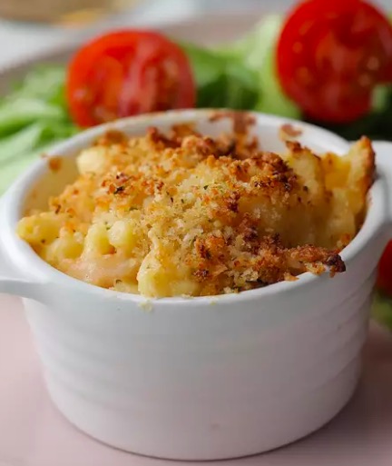 Pour pasta mixture into a baking dish; top with breadcrumb mixture. Bake 15 - 20 minutes until hot, bubbling and the topping is brown.