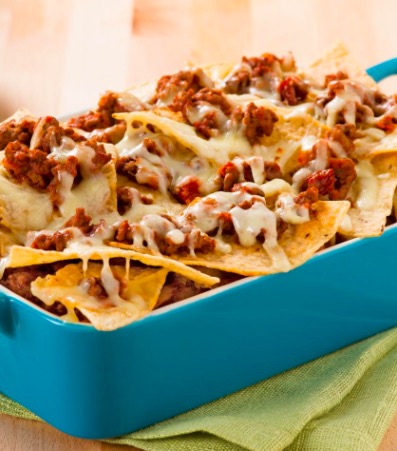 Arrange 1/3 of the Tostitos Cantina® Extra Thick Tortilla Chips in a 7 x 11‑inch lasagna pan. Top with 1/3 of the beef mixture and the mozzarella cheese. Repeat layers twice.