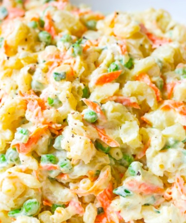 If you love both potato salad and macaroni salad, you can enjoy both with this salad. It's creamy and full of potato chunks, peas, scallions, onion and scallions.