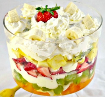 In a trifle bowl, first add a layer of fruit on the bottom, then a 1/2 inch layer of pudding mixture, another layer of fruit, then pudding. Repeat to the top.