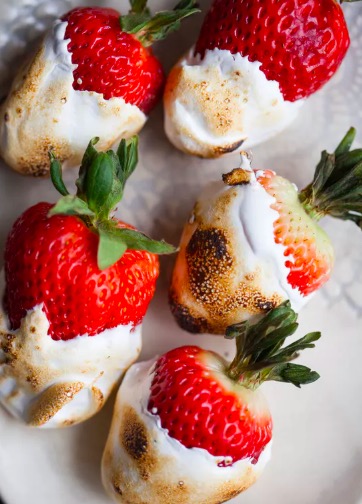 While still holding the strawberry by its top, carefully toast the marshmallow with a kitchen torch until browned and toasty. You can also do this over a gas stove burner, but remove the grate over the burner first. This method is more difficult to control the amount of heat each marshmallow strawberry received; they got darker more quickly and often lit on fire. If you don't mind a real campfire taste, then this works fine. You could also make these over a real campfire.
