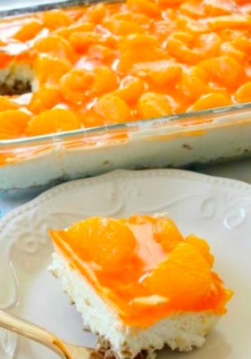 Combine boiling water with orange Jello; stir until completely dissolved; let sit 10-15 minutes, until Jello cools slightly. Pour on top of pineapple-whipped topping. Arrange mandarin orange slices so that they cover the entire surface of the salad.